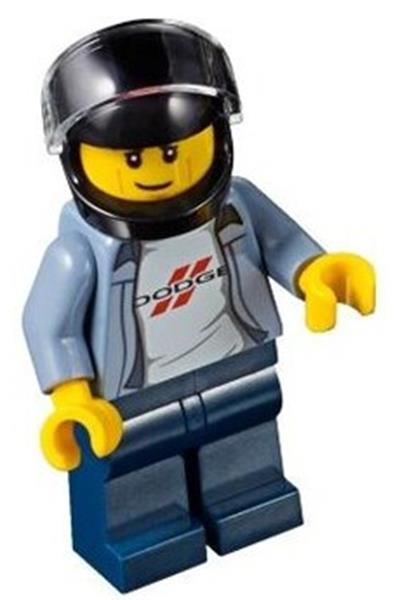 The 1970 Dodge Charger R/T Driver is a minifigure from the LEGO Speed Champions set featuring the 2018 Dodge Challenger SRT Demon and 1970 Dodge Charger R/T. He wears a Dodge-branded shirt and a racing helmet.