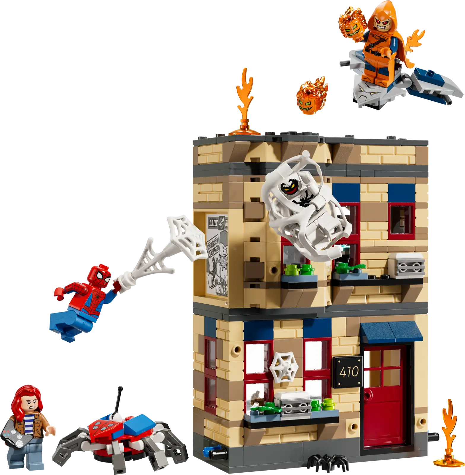 The buildable set contains 4 minifigures: Hobgoblin on his glider with pumpkin bombs; Spider-Man and Anti-Venom blasting webs; and Mary Jane with a jointed spider robot. A giant, flexible web attached to the building can trap a minifigure. In the apartment’s first floor is a kitchen. The upper level has a study and bedroom containing a flip-up bed, desk, computer, camera and a microscope. A push-button function makes part of the building collapse. Kids can connect this build-and-play set to Spider-Man vs. Oscorp (76324) and stack it on top of Spider-Verse: Miles Morales vs. The Spot (76311) for an even bigger play experience. Contains 394 pieces.