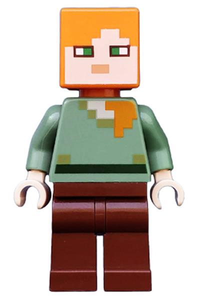 Alex is a minifigure from the Minecraft theme, often depicted with red hair and wearing a green tunic.