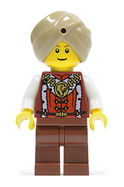 A minifigure with a turban, red snake, white robe, purple belt, black legs, and dark brown hands. The LEGO minifigure is exclusive.