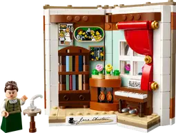 The detailed display model features a Jane Austen minifigure in her lovely home, which contains a small writing table with a quill, a piano with sheet music, a bookshelf, flowers, a cozy fireplace and paintings on the wall showing scenes from movie adaptations of her books. A nameplate is attached to a sturdy base and, from the rear, the display model looks like a book.