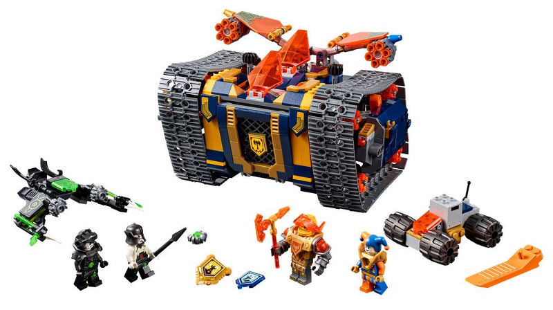 Get ready for a heavy-duty battle with LEGO® NEXO KNIGHTS™ 72006 Axl's Rolling Arsenal, featuring hidden flick missiles and opening drawbridge. Pitch the Jestroyer with its dual 6-stud rapid shooters against the Vyro Glyder. Lock up the critters in the Critter Trapper's storage chest and save Knighton from the tech infection. This popular playset includes 4 minifigures and 3 scannable shields.