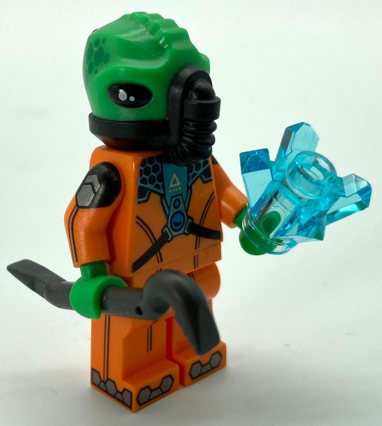 This alien is definitely up to no good! He is wearing what seems to be an orange jumpsuit, is holding a crowbar, and he has stolen some sort of blue crystal.