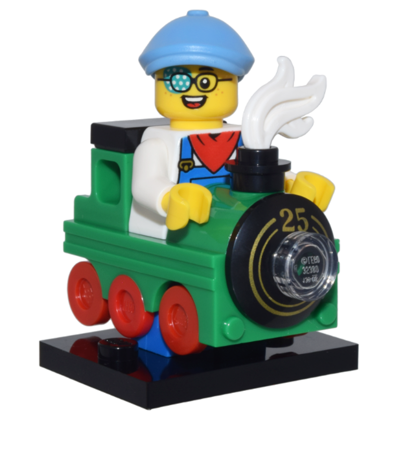 This minifigure is rocking a blue eyepatch, light blue hat, and a fabulous green train costume!