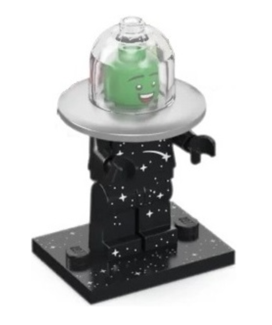 This minifigure has a very clever costume! The flying saucer is situated on their head, while the rest of their body is dressed up like the night sky!